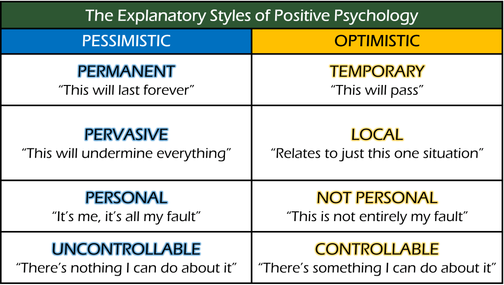 In Karen Reivich and Andrew Shatte’s book, The Resilience Factor, they describe two types of people based on Dr. Martin Seligman’s work in the Positive Psychology field and his “Explanatory Styles.” The first group are those who blame themselves for everything bad that happens to them, they are convinced that these problems will always occur and are therefore unavoidable, and that the consequences of these problems will affect every aspect of their lives. The second group faces problems without blaming it all on themselves, they believe that these problems are not permanent, and that they will not impact every aspect of their lives.