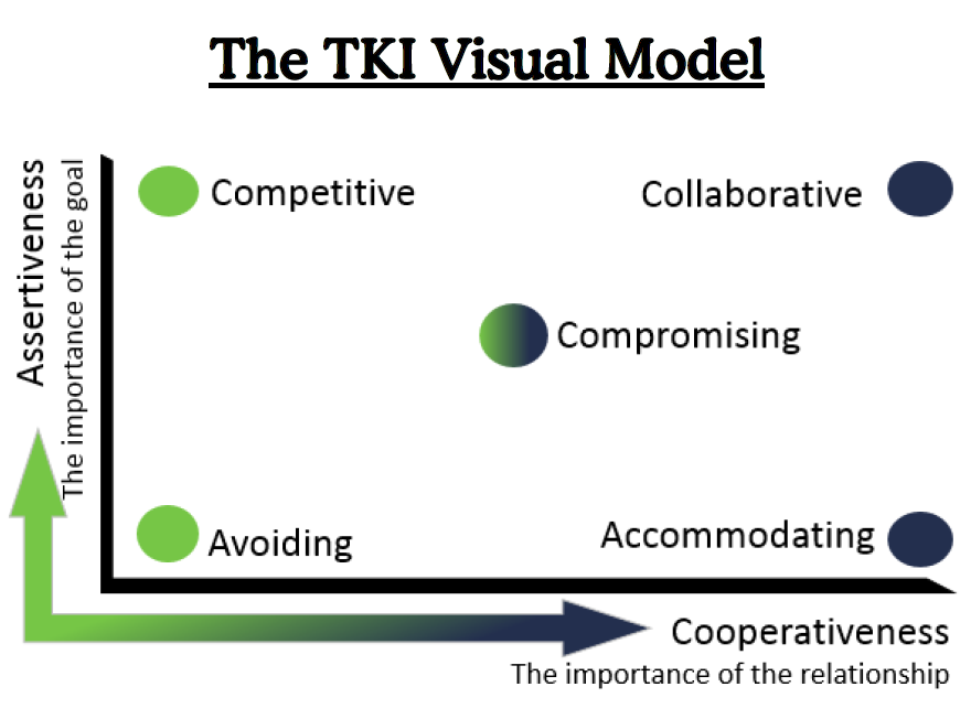 One of the most useful tools for examining how to handle conflict is the Thomas-Kilmann Conflict Mode Instrument, or TKI Model for short. This model was created by Kenneth Thomas, Ph.D., and Ralph Kilmann, Ph.D., for helping people select from a number of identified styles (or what they referred to as modes) for handling conflict.